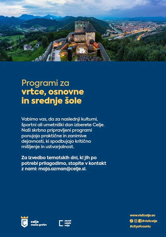 Vabimo vas, da za naslednji kulturni, športni ali umetniški dan izberete Celje. Naši skrbno pripravljeni programi ponujajo praktične in zanimive dejavnosti, ki spodbujajo kritično mišljenje in ustvarjalnost. Za izvedbo tematskih dni, ki jih po potrebi prilagodimo, stopite v kontakt z nami.